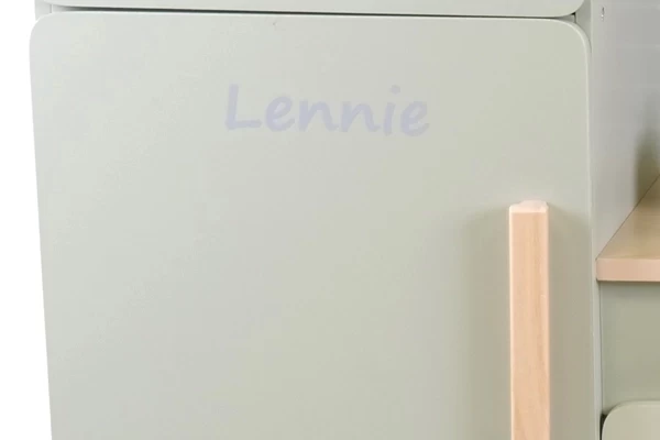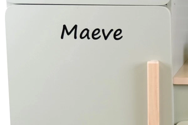 Personaliseer de retro groene XL Modern kinderkeuken met een naamsticker! Van welke chef is deze geweldige keuken? Je ontvangt een witte naamsticker die je zelf mag opplakken. Wil je de naam op de koelkast links? Op het kastje rechts? Of wat hoger op het vriezerdeurtje? Bepaal zelf waar de sticker wordt geplaatst. We drukken een naamsticker van maximaal 10 karakters.