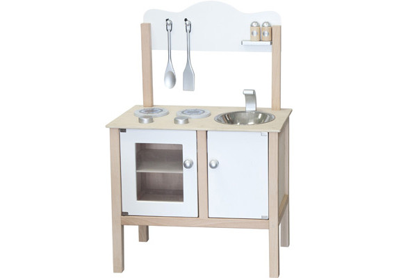 Bak jij straks de lekkerste gerechten met deze leuke houten kinderkeuken van het merk Simply for kids? Het keukentje is voorzien van een kraan met een uitneembare gootsteen, een oventje, een 2 pits gasfornuis en een keukenkastje om al je spulletjes in op te bergen. Daarnaast krijg je er een pollepel, een spatel en een peper en zoutvaatje bij. Dankzij de aanrechthoogte van 47 cm is dit witte keukentje al geschikt voor kinderen vanaf 2 jaar.